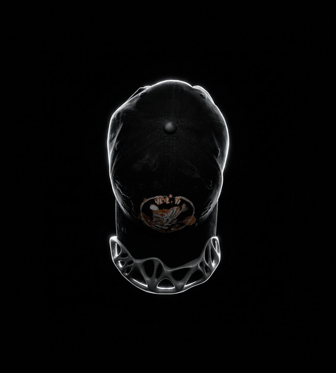 Custom black New Era cap, reinterpreted through an artisanal process.